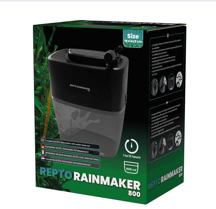 De Repto Rainmaker 800 is een krachtig en betrouwbaar automatisch regensysteem, ideaal voor het creëren van een stabiel en natuurlijk luchtvochtigheidsniveau in tropische terraria, paludaria en kweekopstellingen. Dit systeem is ontworpen voor zowel beginners als ervaren houders en biedt een stille, constante en fijn vernevelde regenval, waardoor dieren zich natuurlijker gedragen en planten beter groeien.